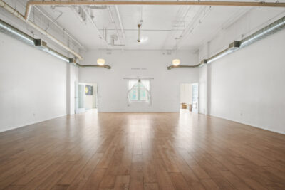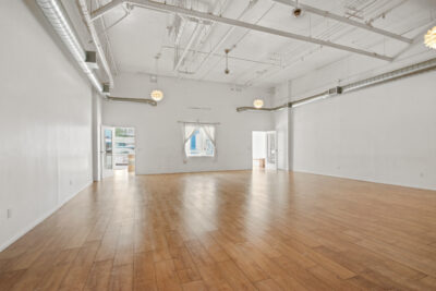 The space features an open floor plan with approximately 15-foot ceilings, creating a bright and functional environment. Previously used as a yoga studio, the layout supports a range of uses including wellness, showroom, or creative retail concepts.